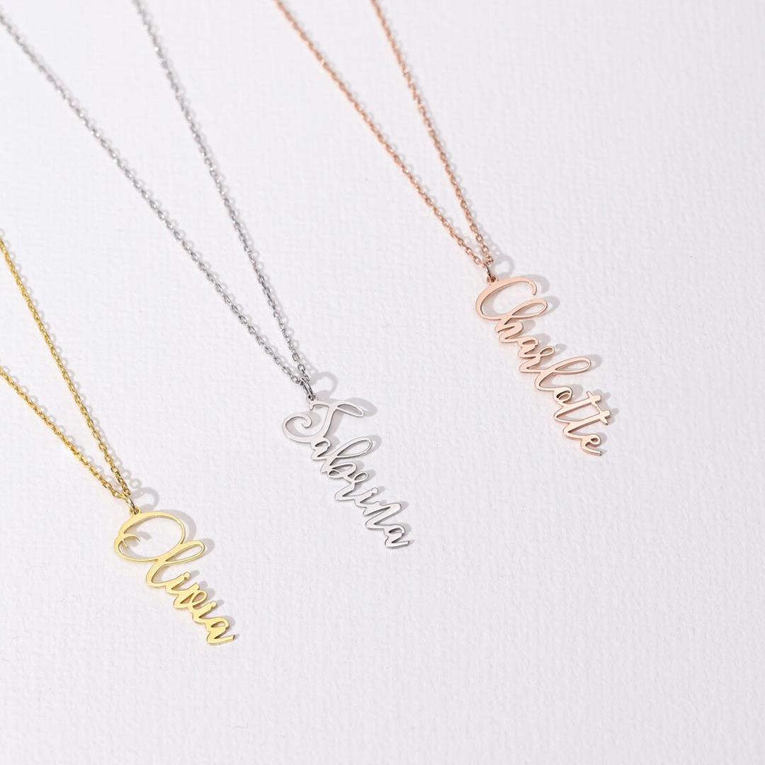 Our Beautiful Signature name necklace has a stylish and design with an elegant finish. The chain length is adjustable. This special name pendant can be customized with your and your loved ones name.