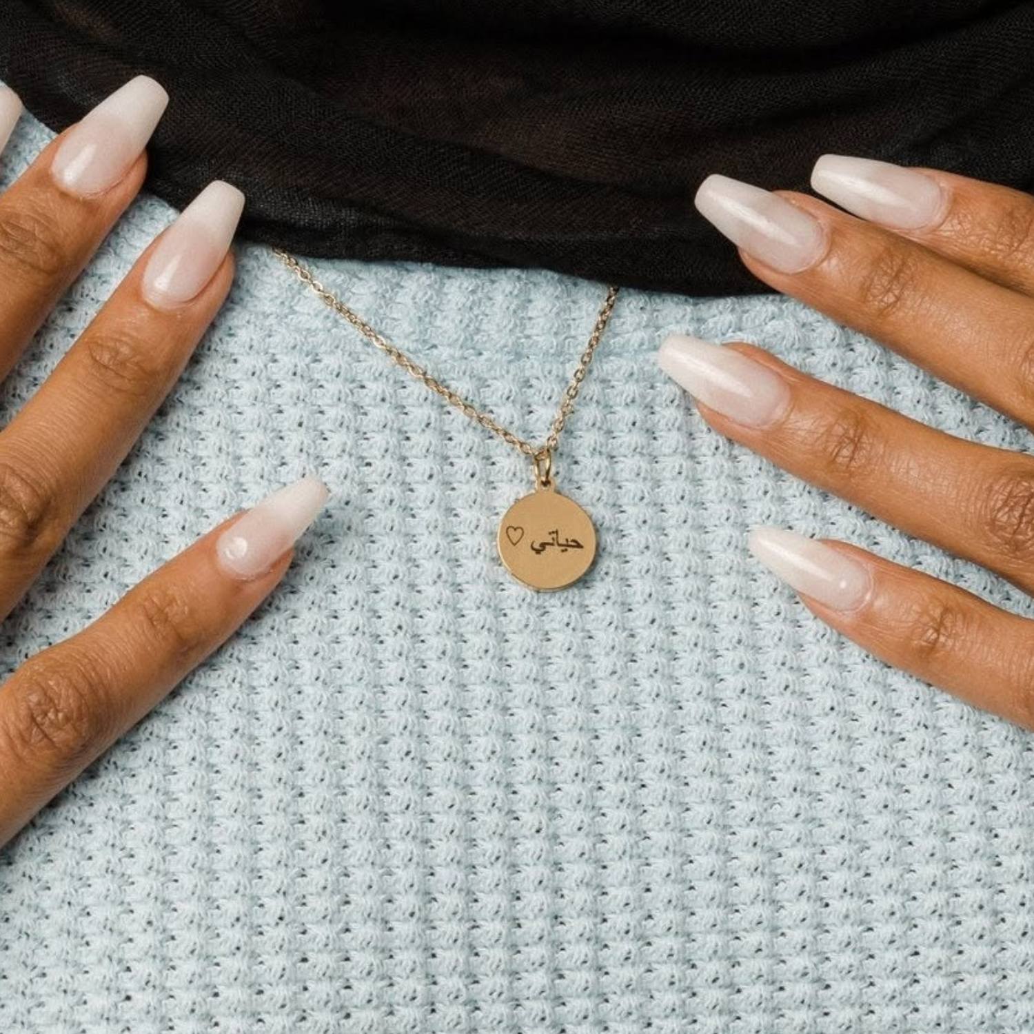 Elevate your modest style with our beautifully crafted Arabic Coin Name Necklace, personalized with your name in elegant Arabic calligraphy. Plated in rich 22-carat gold and finished with a premium anti-tarnish coating, this necklace is designed to maintain its shine and beauty over time — perfect for daily wear, especially with hijab styles.