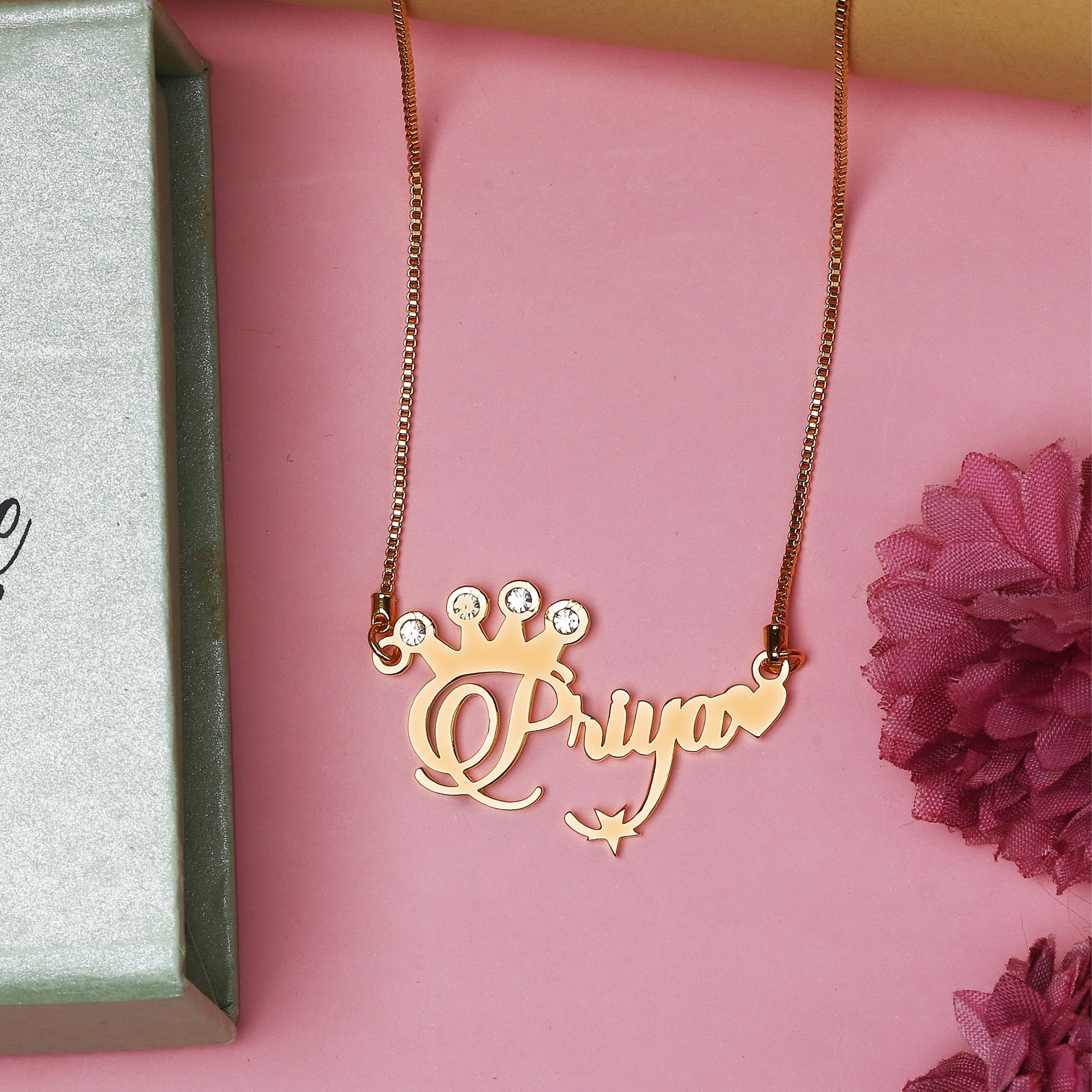 Our Beautiful Diamond crown name necklace has a stylish and unique design with an elegant finish. The chain length is adjustable. This special name pendant can be customized with your and your loved ones name.