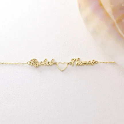 Our Cursive Name Bracelet Couple name in Gold Plating with Elegant in its simplicity, this piece features any name or word you choose – so long as it fits, our artisans can bring your inspiration to life! This bracelet is made with 22k Plated Sterling Silver. It features